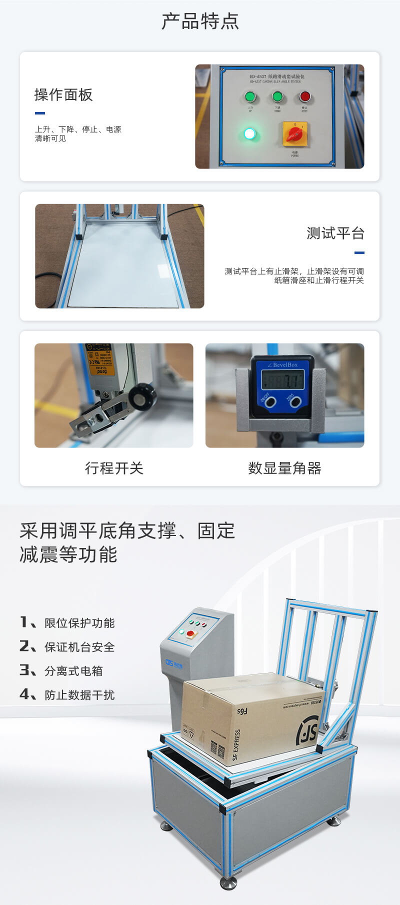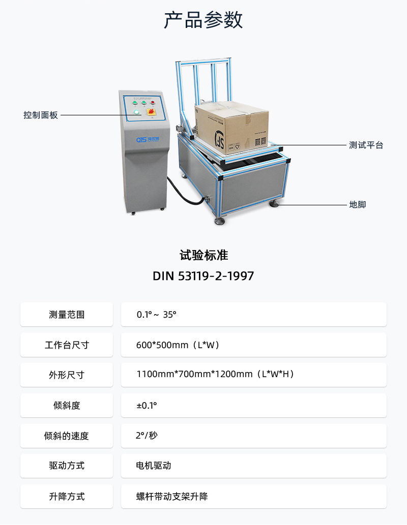紙箱滑動角試驗儀將紙箱滑動角測試儀用于紙箱類傾斜角度抗滑性能測試,在啤酒箱或其他包裝箱堆碼運(yùn)輸時,如果表面磨擦系數(shù)太小,易造成滑落,通過試驗,改進(jìn)包裝耐滑性能。