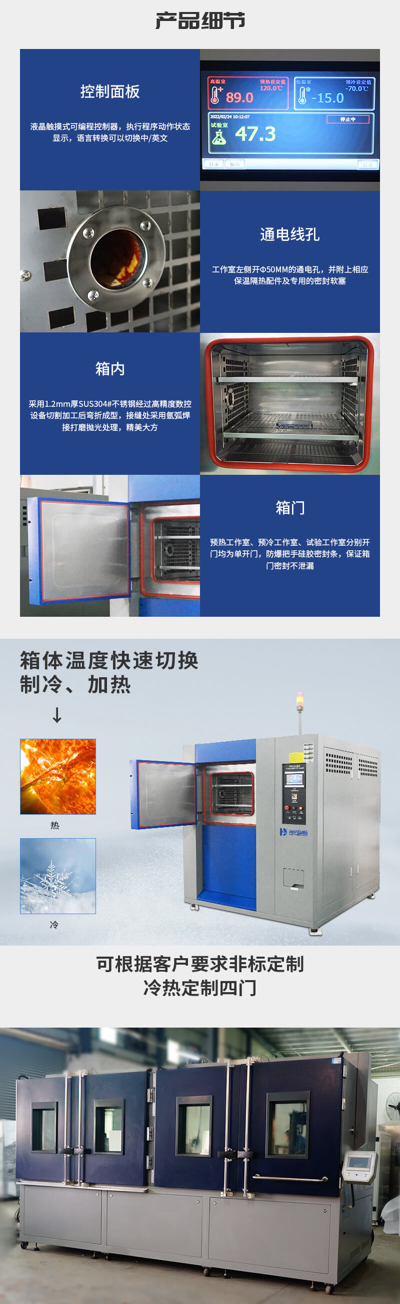 預熱工作室、預冷工作室、常溫沖擊室、試驗工作室間采用加厚保溫層斷熱,接口處采用耐高溫環氧樹脂板斷熱,有效防止熱量互串達到節能的目的;同時預熱工作室、預冷工作室、試驗工作室箱門內板均采用環氧樹脂板進行斷熱,有效防止熱量傳到設備外表影響設備安裝控件溫度,安全可靠。 |